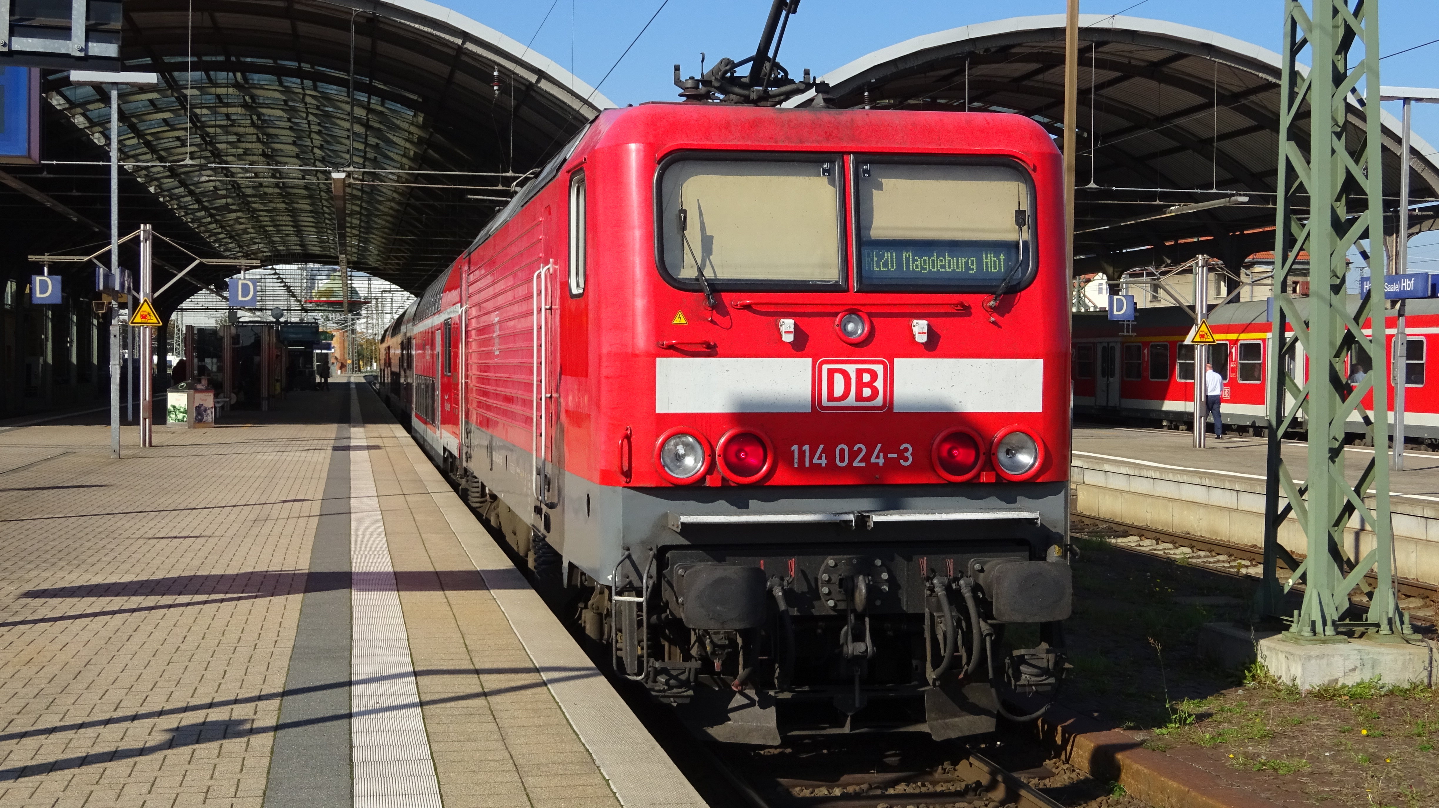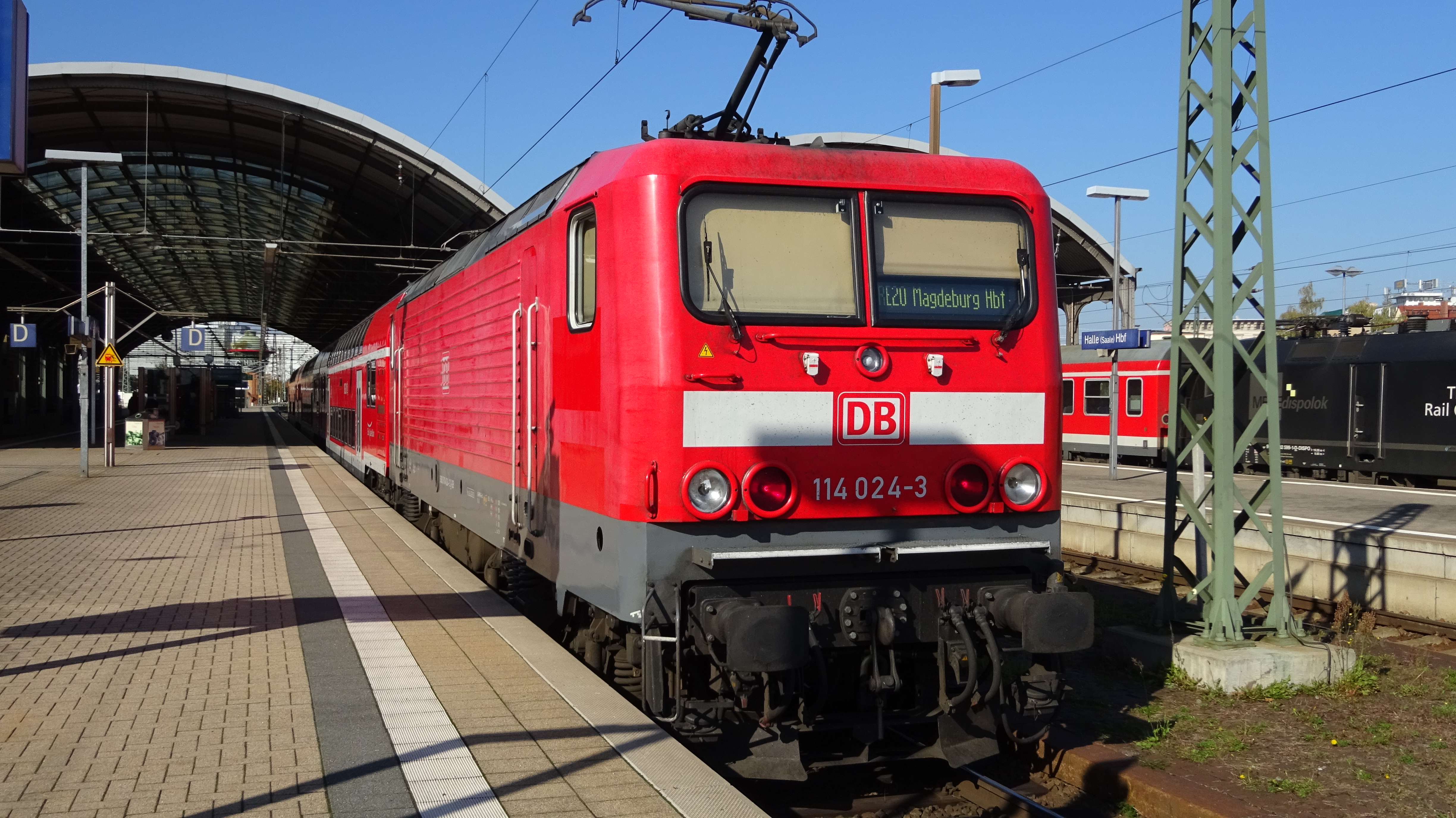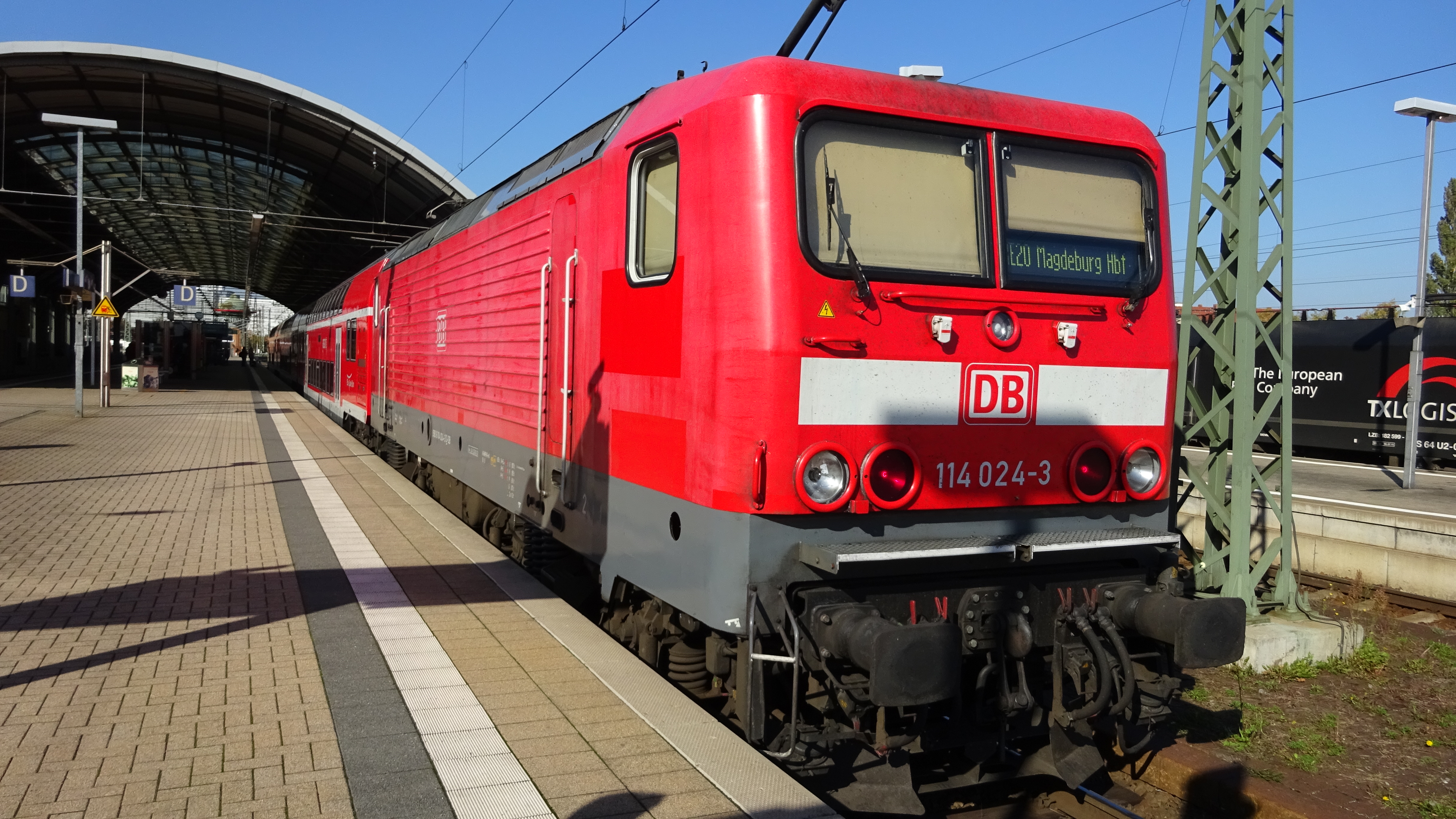 114 024 mit einem RE20 der ElbeSaaleBahn in Halle (10. Oktober 2015)